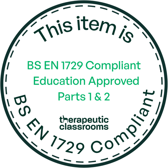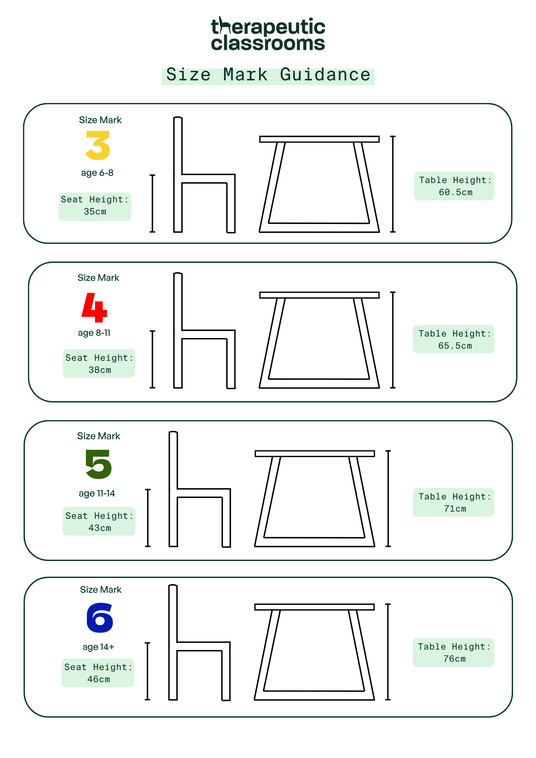 Each size mark corresponds to a specific seat height and approximate child height range. The size mark on the chairs is then paired with the size mark on the tables to ensure they are the right size for each year group.